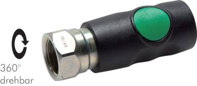 •Coupling head can be rotated - after being screwed in, the push button can be turned to a position that is optimal from an ergonomic point of view, •safety function is controlled via residual pressure on plug side (only plastic type), •antistatic, compliant with ATEX 2 standard (no potential source of ignition) and can therefore be used in spray booths, gas environments or grain transfers (only plastic type), •plastic body prevents surfaces from being scratched (only plastic type), •manufactured without silicone (only plastic type)